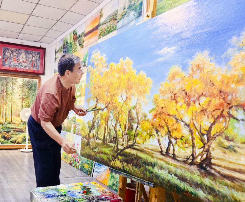 (記者;魏述、藝冰)承德是座歷史名城,文化底蘊(yùn)深厚,在這山川靈秀的土地上,有一位熠熠生輝的油畫大師,他身材高大,英姿挺拔,舉止干凈利落,思維敏捷,步履帶風(fēng),眉宇間透露著英氣,聲音洪亮而富有磁性,讓人感受到他內(nèi)心的堅(jiān)定與自信,宛如一位久經(jīng)沙場(chǎng)的軍人,威嚴(yán)而莊重。然而,他還有著截然不同的另一面,當(dāng)他拿起畫筆,輕點(diǎn)畫布,瞬間便能暈染出燦爛絢麗的大千世界,描畫出百態(tài)叢生的生靈萬物,從中透露出一種雋永優(yōu)雅的文人氣質(zhì)。他就是被譽(yù)為“軍旅藝術(shù)家”的承德油畫大師---王永